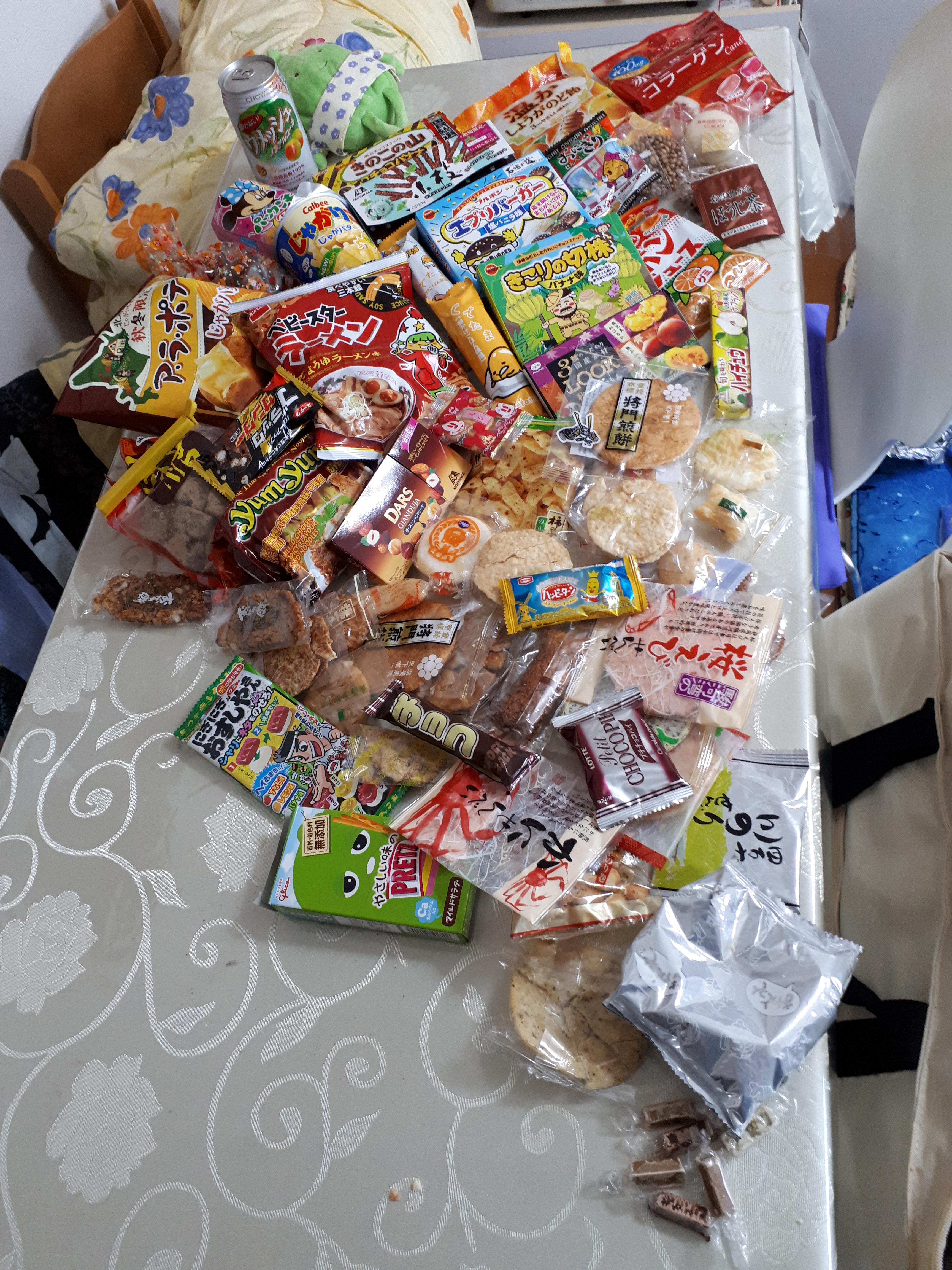 A huge assortment of Japanese snacks someone gave me upon my arrival, including (brace yourself) salad-flavoured pretzels.