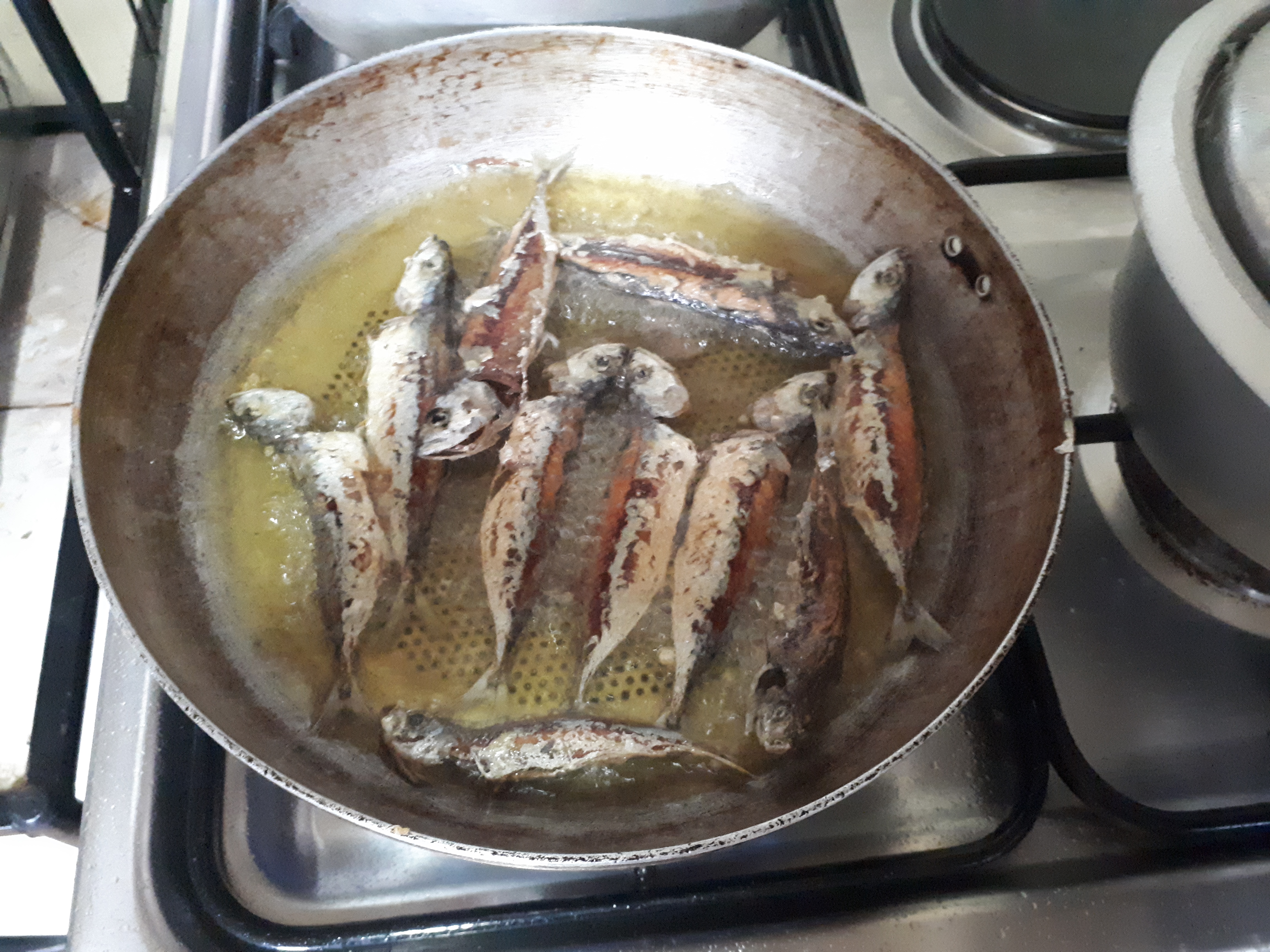 Ten or twelve fishes later, the initial popping step had almost become a satisfactory sensation. When the whole collection lay squeaky clean, my friend demonstrated how to fry the fish in oil, like pancakes. (Though pancakes, typically, leave fewer eyeballs floating in the pan.) Finally, she taught me how to peel the white meat off the bones and dig in.