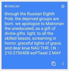 Clearly, my poor smartphone had no real grasp of the matter at hand. But perhaps if I attempted the translation enough times to find a common denominator, I could piece together a clearer idea of what in the world the stranger on the train had given me.